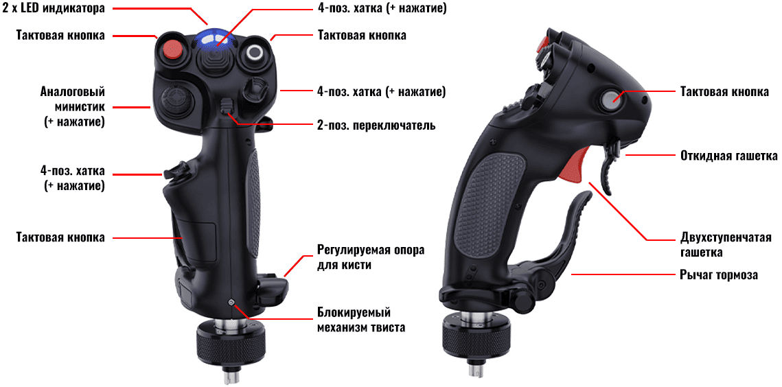 Точный аналоговый министик для управления прицельными комплексами и марками обеспечивает быстрый захват целей, а 3 х 4-позиционных хатки закроют любые вопросы управления другими системами!